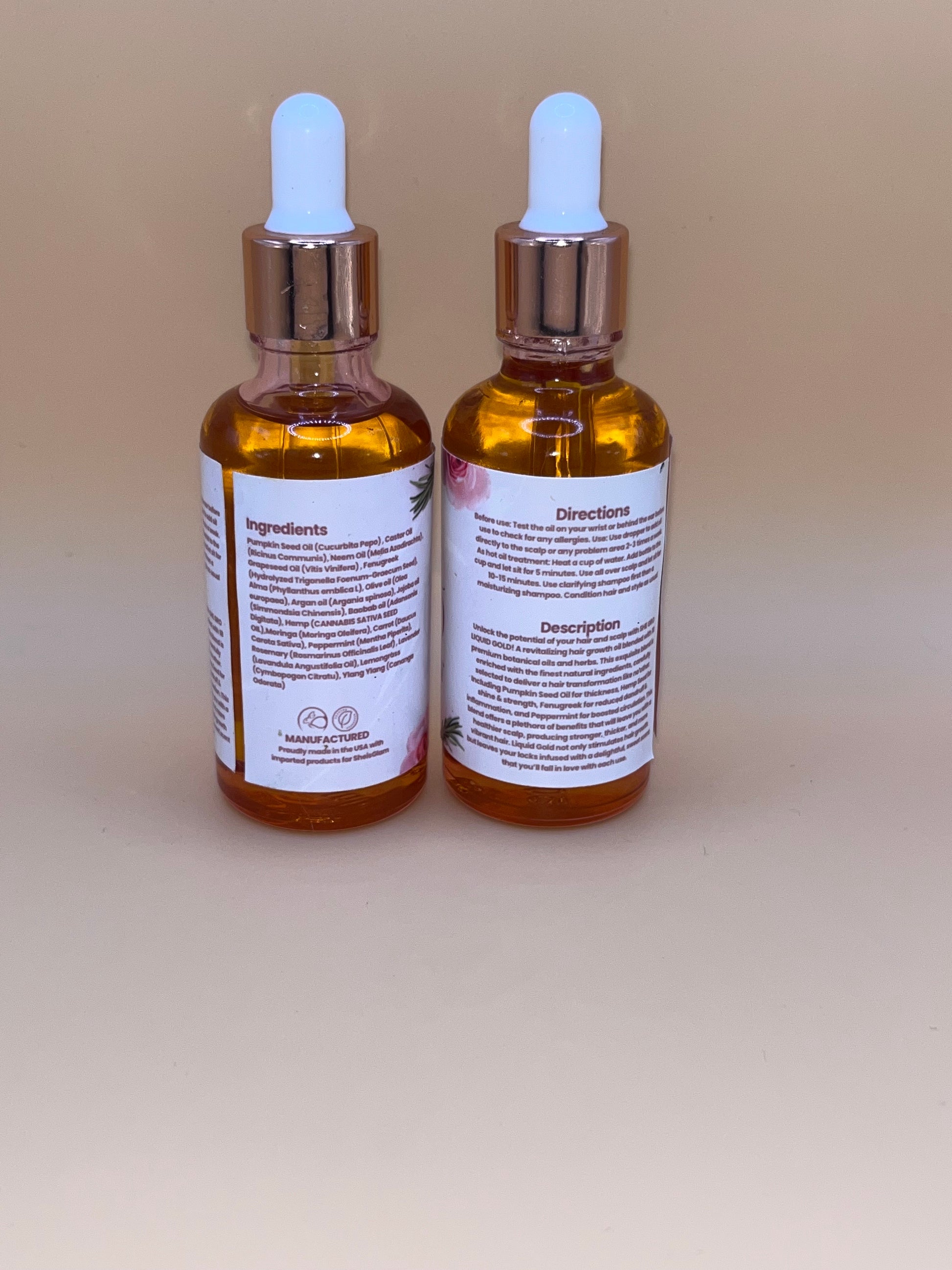 A revitalizing hair growth oil blended with 18 premium botanical oils and herbs. This exquisite blend is enriched with the finest natural ingredients, carefully selected to deliver a hair transformation like no other. Including Pumpkin Seed Oil for thickness, Hemp Seed for shine & strength, Fenugreek for reduced dandruff & inflammation, and Peppermint for boosted circulation. This blend offers a plethora of benefits that will leave you with a healthier scalp, producing stronger, thicker, and more vibrant hair. Liquid Gold not only stimulates hair growth but leaves your locks infused with a delightful, sweet scent that you’ll fall in love with each use.